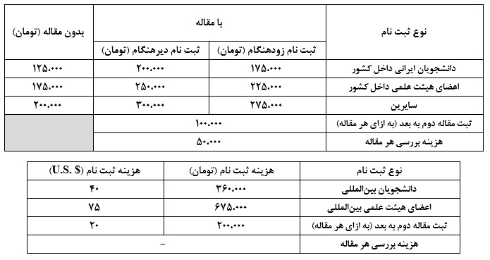 - در صورتی که یک نویسنده بیش از یک مقاله پذیرفته شده داشته باشد، پس از ثبت نام خود بهمراه ثبت مقاله اوّل، باید برای ثبت هر یک از مقالات دوّم تا پنجم مبلغ 1,000,000 ریال بپردازد.